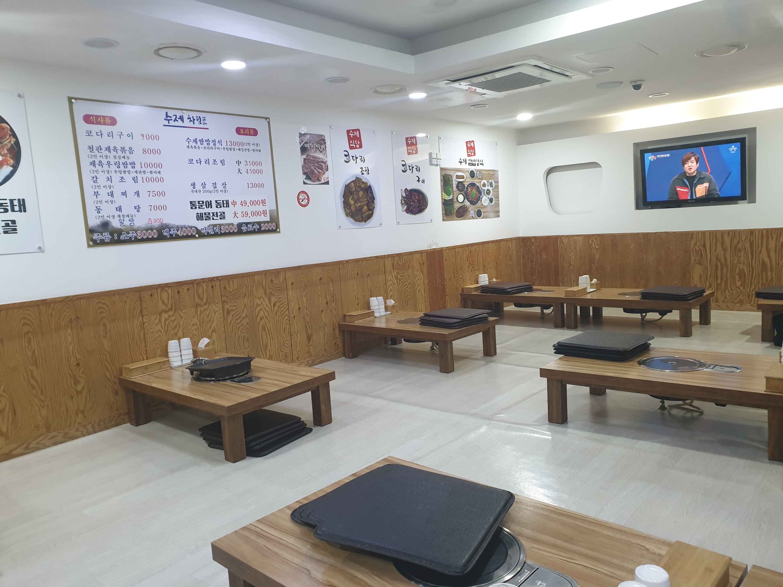 코다리구이 9,000 | 철판제육볶음 8,000 | 제육우렁쌈밥 10,000 | 갈치조림 10,000 | 부대찌개 7,500 | 동태탕 7,000 | 알탕 8,000 | 수제쌈밥정식 13,000 | 코다리조림 35,000 | 생삼겹살 13,000 | 통문어 동태 해물전골 49,000