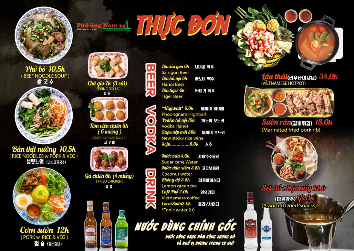 양지차돌쌀국수 11,000 | 후띠우쌀국수 12,000 | 매운소고기쌀국수 12,000 | 똠양꿍쌀국수 12,000 | 곱장 순대 쌀국수 12,000 | 새우 볶음면 12,000 | 새우 볶음밥 11,000 | 파인애플 볶음밥 12,000 | 소고기볶음밥 12,000 | 소고기 공심채 덮밥 13,000 | 껌쓰언 (돼지고기 덮밥) 13,000 | 짜조(6pcs) 10,000 | 새우볼 10pcs 9,000 | 모듬반미 9,000 | 분짜 14,000 | 분짜냄 14,000 | 소고기 공심채 15,000 | 마늘 공심채 10,000 | 치킨봉 튀김 13,000